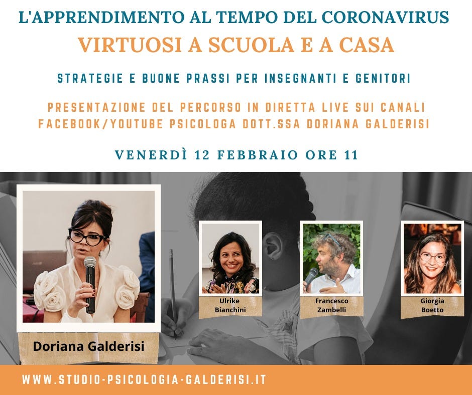 L'Apprendimento al tempo del Coronavirus Strategie e buone prassi per INSEGNANTI e GENITORI... un 'assaggio' in anteprima streaming.. Doriana GalderisiFeb 11, 2021Sharehttps://m.facebook.com/story.php?story_fbid=252339003004477&id=100046851382298